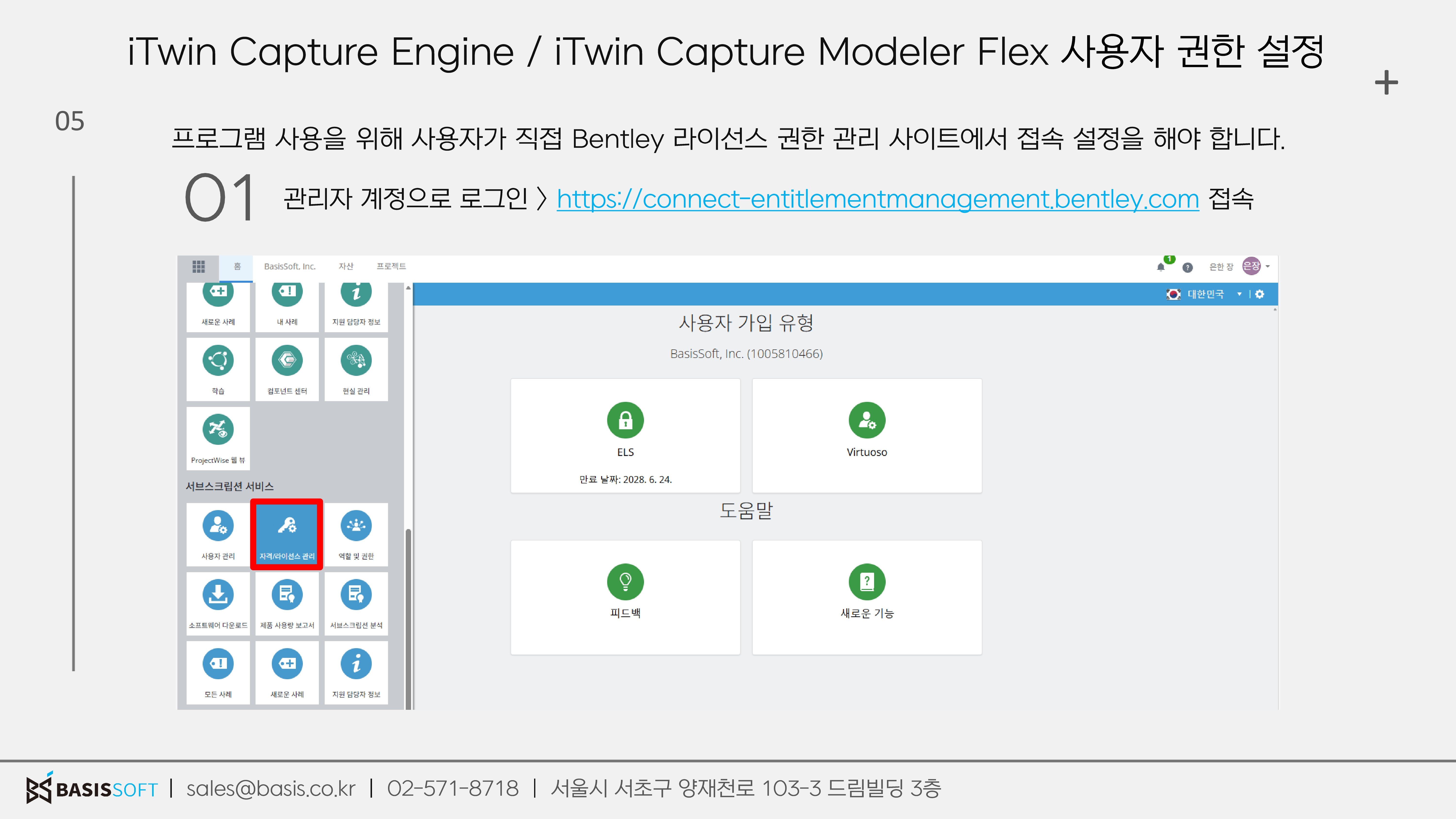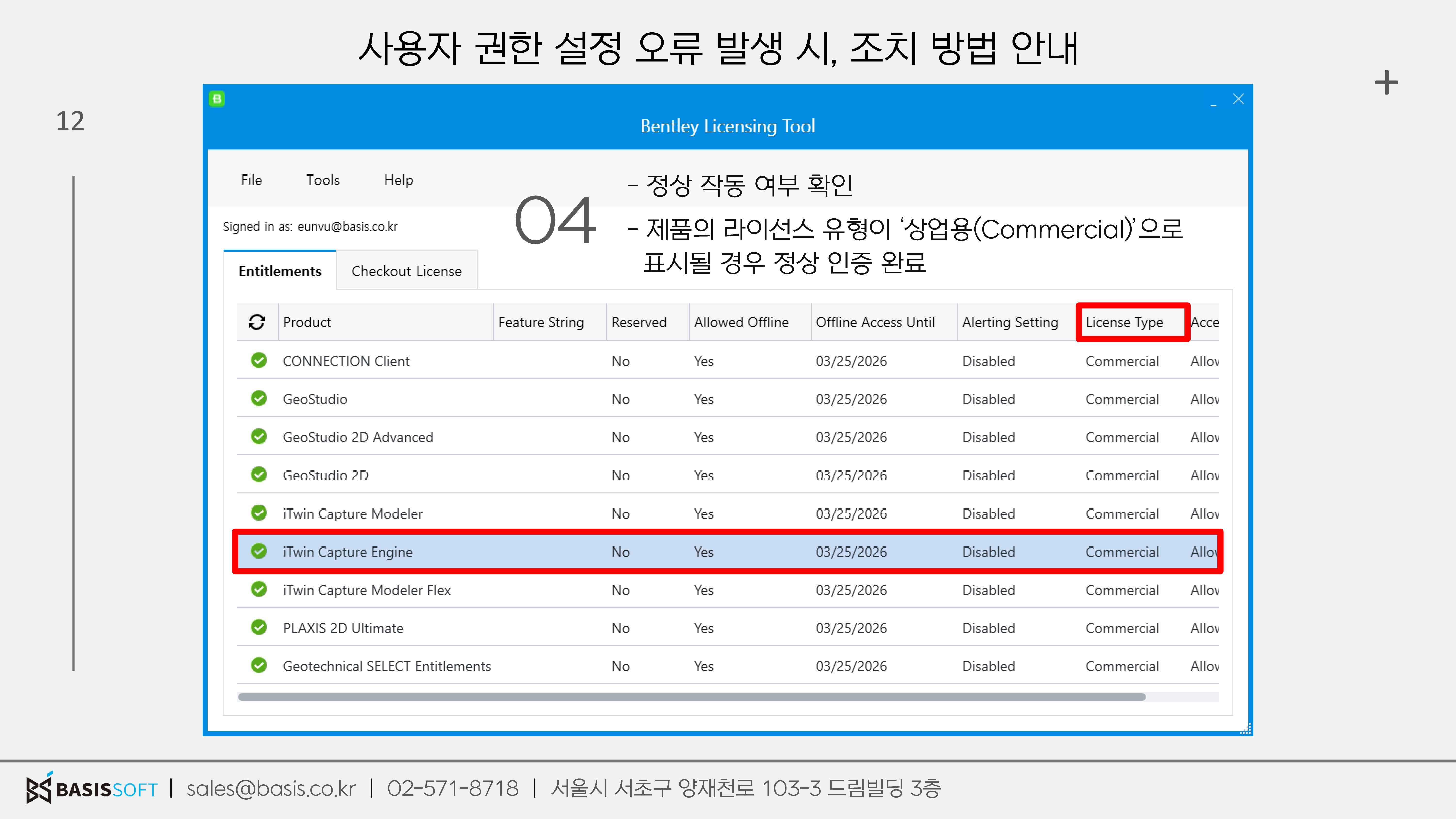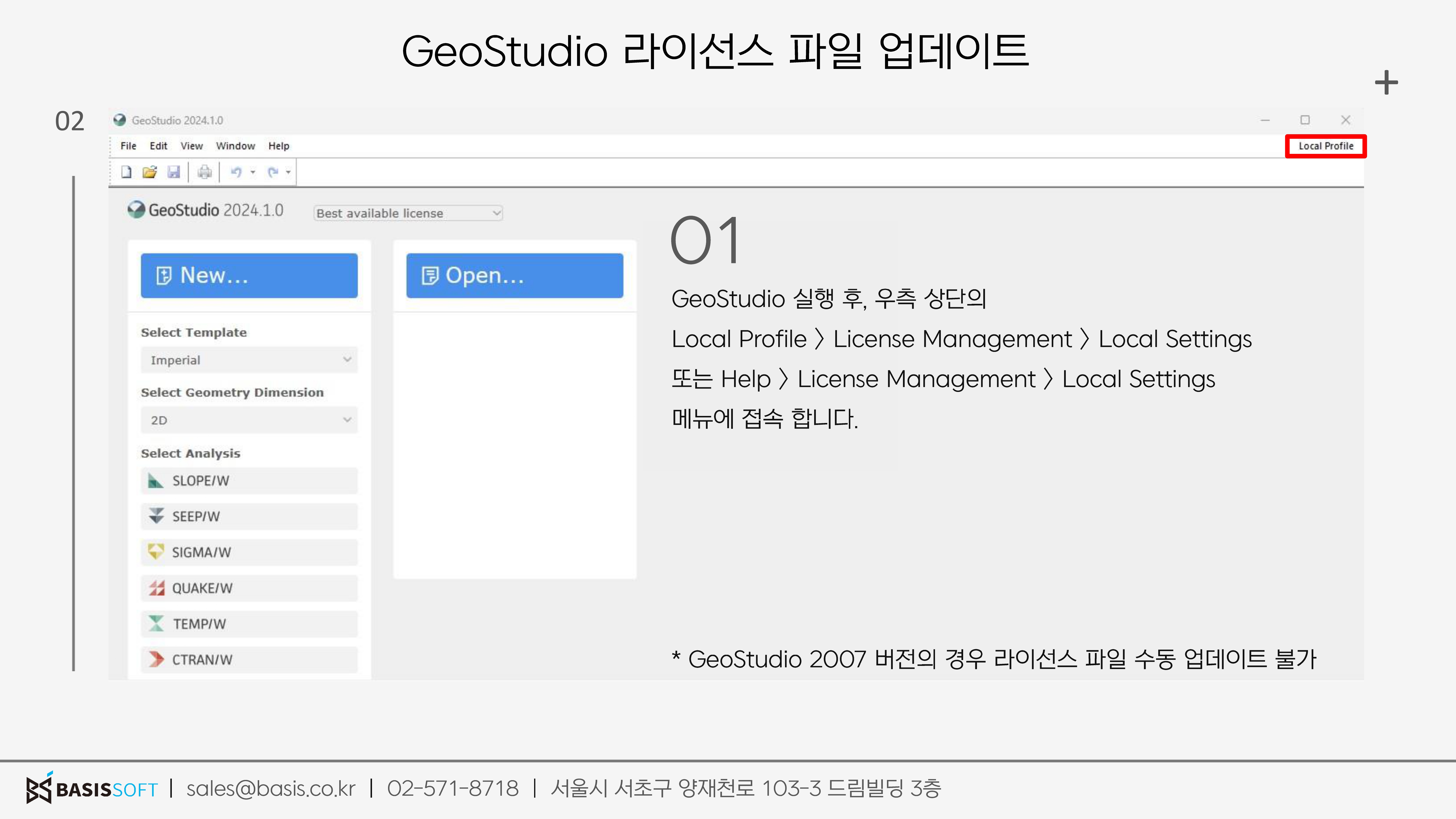 4. 클라이언트 PC에서 GeoStudio 프로그램을 설치 및 실행하여 우측 상단에 Local Profile - License Management 선택 후 Choose 항목에서 래거시 Flexible ... 선택. (나머지는 시퀀트 임대나 벤틀리 구독에서 사용.) License Management 창에서 Available Licenses 항목에서 활성화된 라이선스 확인 가능