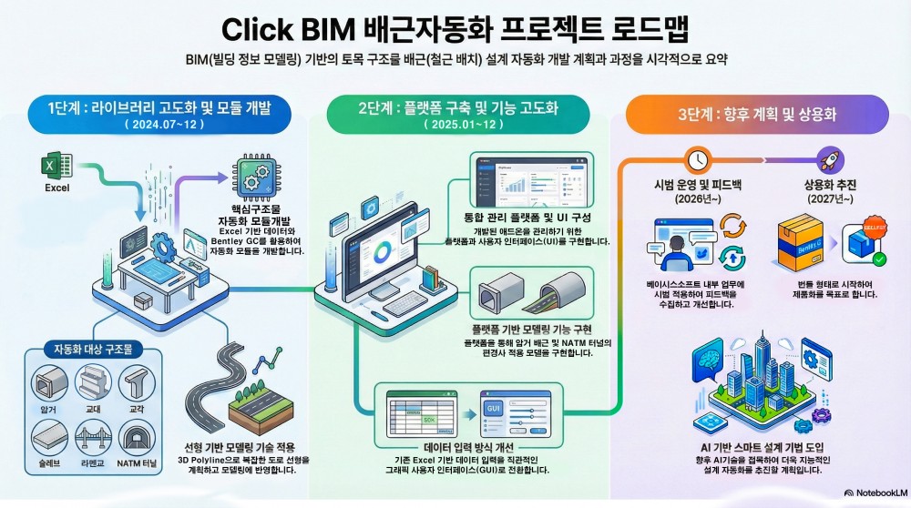 이번 발표는 도로·교량·터널 등 인프라 구조물을 대상으로 한 전면 BIM 설계 자동화 체계 구축 연구의 중간 성과로, 구조 설계 논리를 디지털화해 반복 가능한 자동화 로직으로 구현하는 데 초점을 맞췄다.