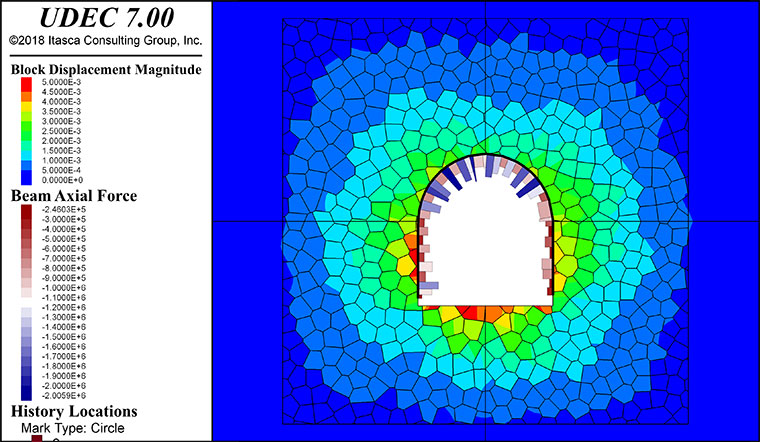 UDEC은 2차원 암반 절리 해석 프로그램입니다. 개별요소법(DISTINCT ELEMENT METHOD)을 이용하여 블록 단위의 재료에 대한 상호 연계 거동을 고려한 범용 해석 프로그램이며, ITASCA에서 자체 개발된 그래픽 인터페이스인 GIIC의 적용으로 모델링에서 부터 해석 및 결과 분석까지 모든 작업이 WINDOW 상에서 가능하고, 기존 COMMAND 방식의 모델링도 지원합니다.