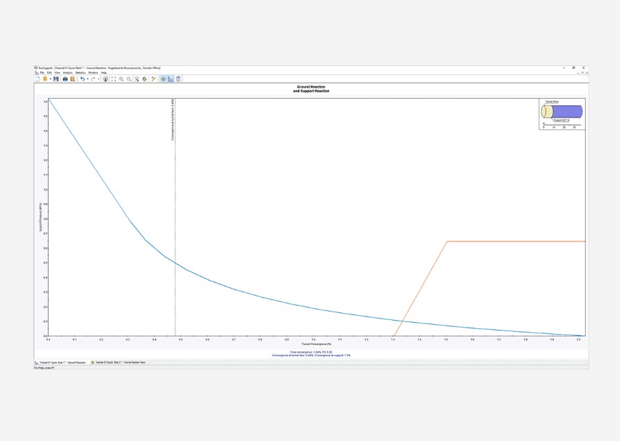 터널 및 지보 시스템의 예비 설계 : RocSupport 는 터널 및 지보 시스템의 예비 설계를 하기 위한 도구로 사용될 수 있습니다. 유한요소해석 프로그램 등으로 세부 설계를 하기에 앞서 다양한 터널 지보 옵션에 관한 정보를 제공해서 효율적인 예비 설계를 가능하게 합니다. 이 프로그램은 연암 지대에서 터널 굴착에 적합합니다.