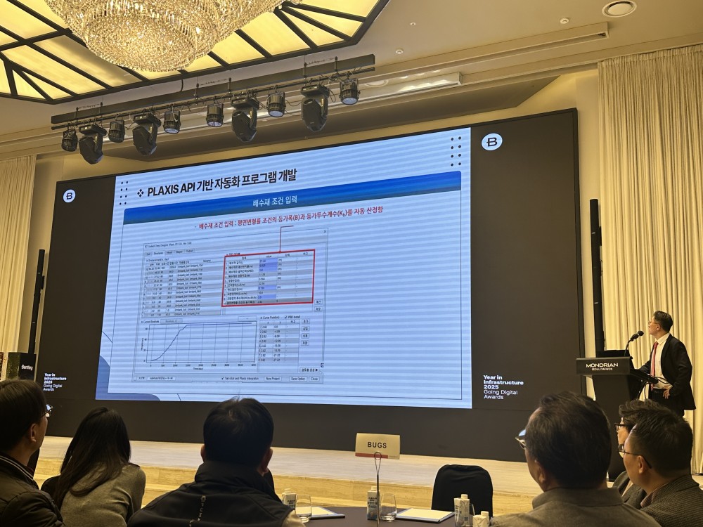 At this event, BasisSoft CEO Junsang Ahn delivered a presentation titled “Automation of Soft Ground Consolidation Analysis Based on Bentley PLAXIS API,” introducing a soft ground design automation program developed using Python.